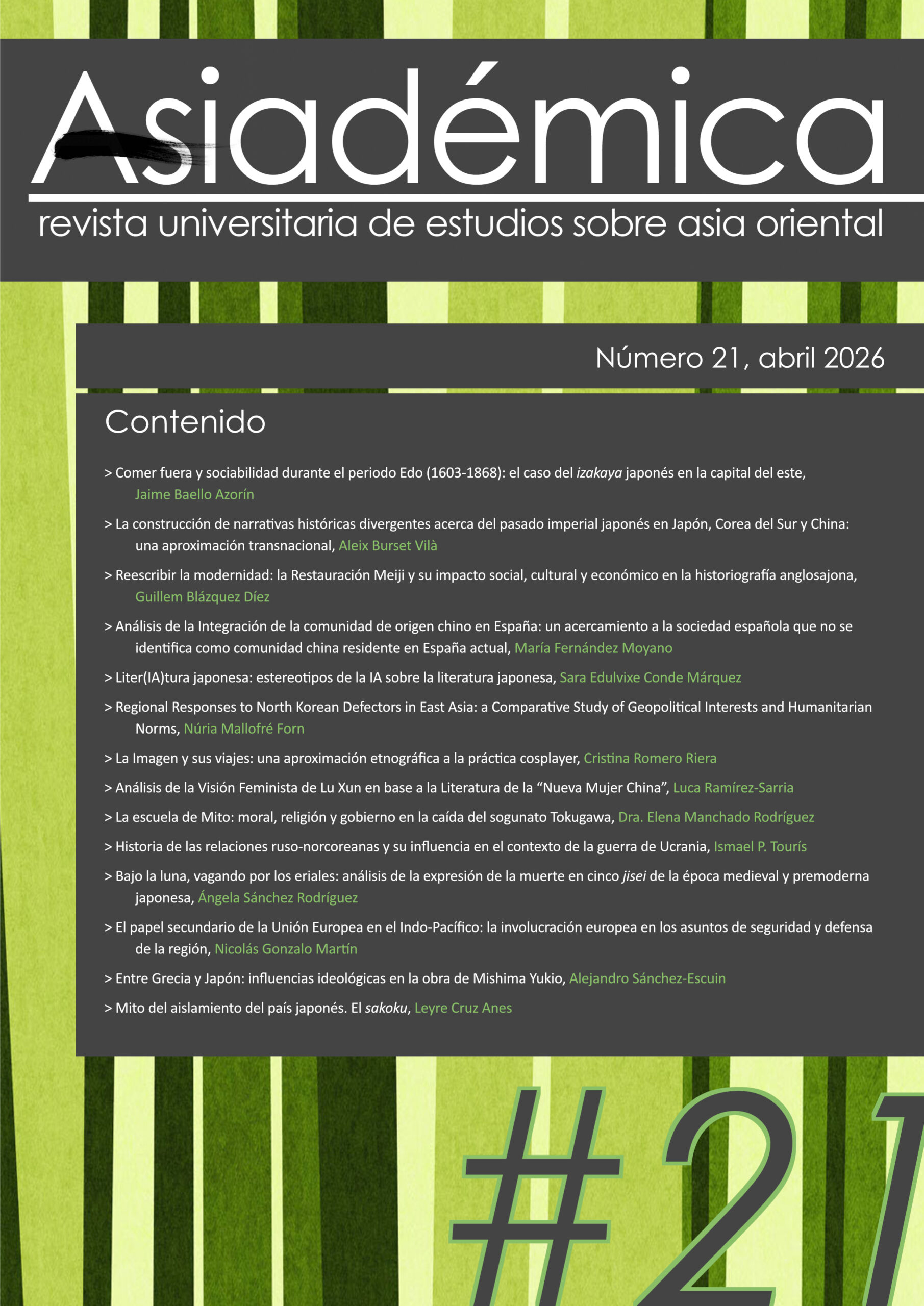 Como cada año en primavera, ya está aquí Asiadémica con un nuevo número, un número redondo, en esta ocasión, lo tienes disponible aquí o a través del menú. Este #20 es, además, de los números más nutridos en cantidad y diversidad disciplinaria e institucional (dieciséis artículos de diez universidades distintas). Viene encabezado por un prólogo de Sonia Dueñas, profesora e investigadora en la Universidad Carlos III y referente de los estudios de cine coreano en nuestro país, en el que comparte un excelente (y crítico) repaso y evolución del hallyu u ola coreana. Nos alegra acoger de nuevo a Enrique Mora Roás, quien ya publicó con nosotros en el #12 y que regresa esta vez con un artículo sobre la construcción de la política disidente en el Japón de preguerra. Juan Manuel Delgado Jiménez ofrece un estudio del discurso político en China, centrándose en el tema de la «humillación nacional» y cómo se ha usado para articular significado según cada momento. Siguiendo en la línea de los estudios del discurso, Anna Santos López traza la transformación de las distintas estrategias recientes de soft power por parte del estado japonés y Daniela Almanares Juárez la representación de la mujer coreana en libros de texto coloniales en Japón. Pasando a preocupaciones más literarias, Sonia López Giménez trabaja la obra de Kang Younghill y en particular el concepto de tercer espacio en la modernidad; Qingping Qin comparte un estudio comparativo entre obras de literatura infantil china y española, en particular aquella que trata temas de trauma; María del Sol Herrera Recio traza las particularidades de la obra del novelista chino Mo Yan; y Yesica Rebollar Crespo nos comparte su lectura en clave de posthumanismo de dos obras, una de Larissa Lai y otra de Chang-rae Lee. En el ámbito sociolingüístico y pedagógico, tenemos los trabajos de África Nadal Hernández sobre las wakamono kotoba; el artículo de Francisco de Asís Corrales Pavía sobre la traducción y comentarios del Man’yōshū; el estudio del nivel de comprensión pasiva de los estudiantes hispanohablantes de chino realizado por Irene Pérez; y la comparativa crítica entre Hagoromo y Völundarkviða de Joel Mayordomo Sierra. Tenemos también dos trabajos sobre estudios de arte: Laura Plensa Guijarro analiza la evolución del Museo Nacional de Palacio taiwanés y Alazne Sesmero Lara traza estrategias artísticas sobre la memoria histórica en el arte contemporáneo japonés. Por último, en el ámbito antropológico, contamos con dos trabajos que hablan sobre la comida en Japón; por un lado, Jaime Baello Azorín y su análisis historiográfico sobre los izakaya y, por otro, Ramón del Río Calvo, que se pregunta qué será lo que tiene la comida española que atraiga a los japoneses.